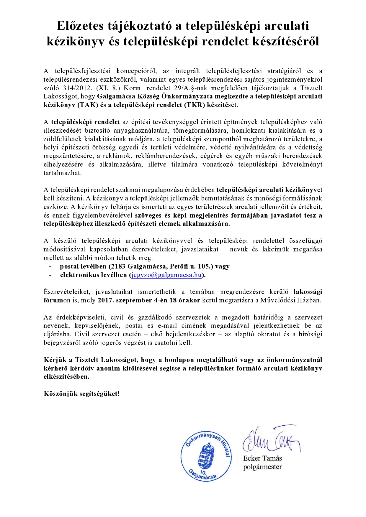 Településképi Arculati Kézikönyv készítésével kapcsolatos kérdőív: